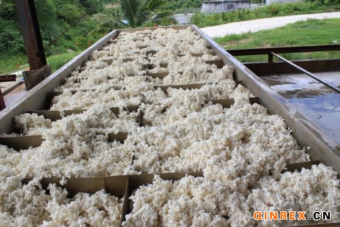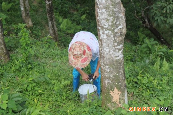 不同季節(jié)、不同品種,排膠時間的長短有很大差異,當絕大部分膠樹已經(jīng)斷滴時便可收膠,必須在太陽升出來前完成收膠工作。收集碗內(nèi)的鮮膠乳后樹上留下的膠線及膠杯中剩余的凝膠。它一般可制成l0號、20號標準橡膠,薄褐縐膠片,混合縐膠片和充油橡膠等產(chǎn)品。