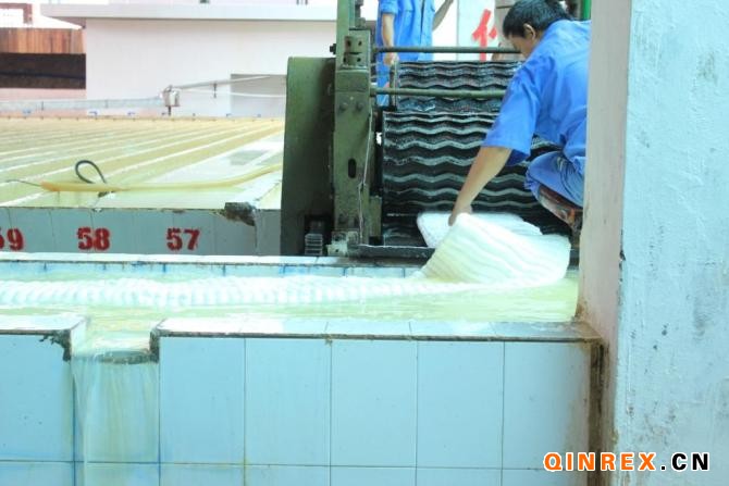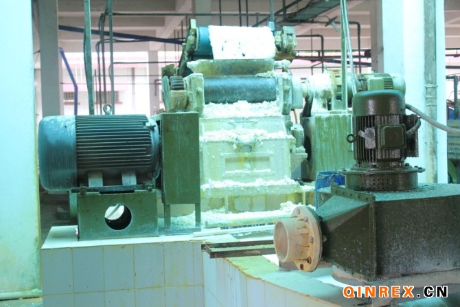 把凝固的膠乳通過機械滾壓,脫水變?yōu)檩^薄,厚度一致的凝塊。這增加了膠片的表面積,縮短干燥時間。同時使膠料的強度增加和得到初步造型的目的,有利于保證膠料進一步加工的質(zhì)量,提高生產(chǎn)效率。