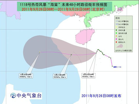 今年第18號(hào)熱帶風(fēng)暴“海棠”的中心9月26日09時(shí)位于海南三亞東南方約198公里的南海西部海面上,就是北緯17.0度、東經(jīng)111.1度,中心附近最大風(fēng)力有8級(jí)(18米/秒),中心最低氣壓為995百帕。