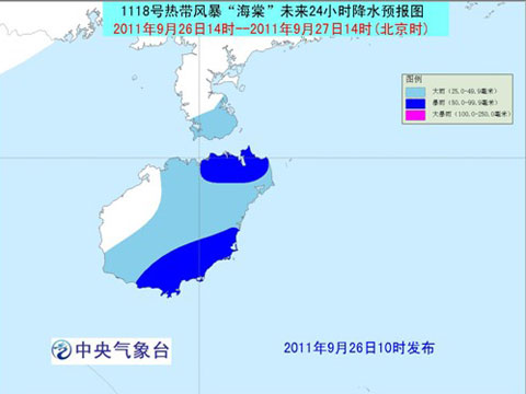 預(yù)計(jì),“海棠”將以每小時(shí)10公里左右的速度向偏西方向移動(dòng),強(qiáng)度變化不大。受“海棠”和冷空氣的共同影響,26日14時(shí)到27日14時(shí),南海大部、北部灣、瓊州海峽、海南沿海、臺(tái)灣海峽將有7-8級(jí)大風(fēng),部分海域陣風(fēng)將有9-10級(jí);海南大部和雷州半島部分地區(qū)有大到暴雨,雨量一般有40~80毫米。