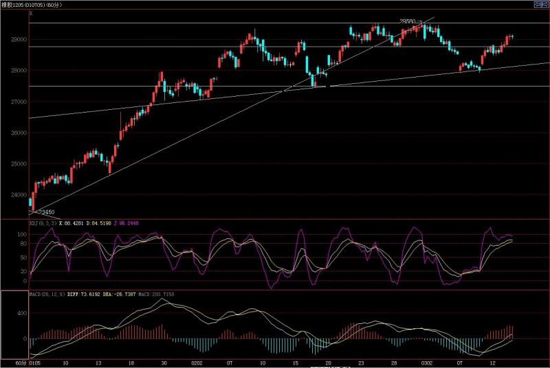 天膠價(jià)格MACD指標(biāo)顯示,從負(fù)值反彈,DIFF和DEA指標(biāo)走勢(shì)趨于強(qiáng)勁,表明從28000開始的短期反彈預(yù)期仍然存在。但KDJ指標(biāo)的走勢(shì),相比前一交易日,進(jìn)入超買區(qū)間。當(dāng)價(jià)格接近29500的前期高點(diǎn),上方的壓力越來越明顯。所以,短期內(nèi)向上反彈的空間不做過大預(yù)期。近期謹(jǐn)慎關(guān)注前期高點(diǎn)的壓力作用。