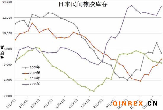 2011年8月之前日本民間天膠庫存雖然延續(xù)季節(jié)性下滑趨勢,但明顯幅度較小。一般4月份開始,庫存就會出現明顯下降,但是今年比較堅挺,說明日本地震降低了市場需求。自8月份開始,庫存掉頭猛增,遠遠超過年初的存量,背離近幾年的市場趨勢。