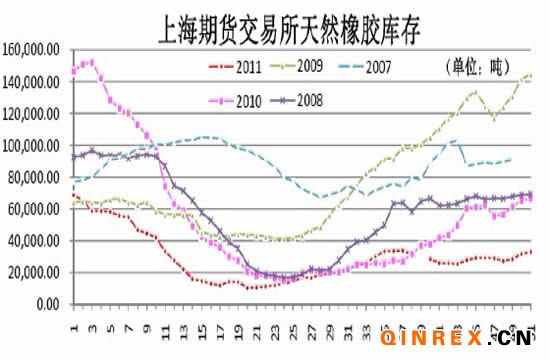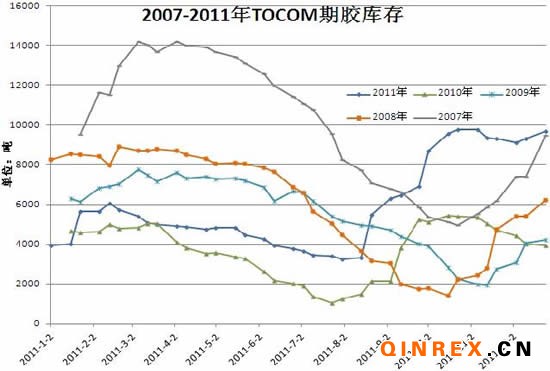 與日本期貨庫存相比,2011年,上海滬膠期貨庫存處于近五年相對較低水平,年初受膠價較高影響,現貨商接貨意愿不強烈。第四季度則受期貨膠價暴跌影響,庫存也一直在低位徘徊。