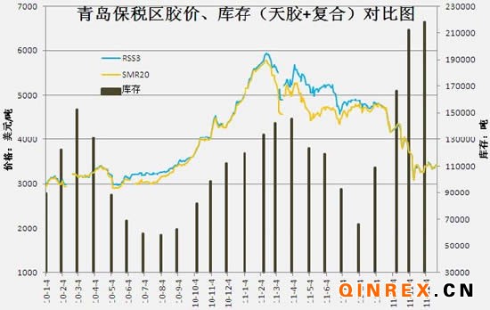受宏觀調控、歐債危機等影響,青島保稅區(qū)橡膠庫存變化較大。從圖上可以看出,價格對庫存有較強的引導意義。在經濟復蘇時期,比如2010年8月至2010年12月,國內汽車消費攀升,輪胎產量增加,伴隨價格的上漲,青島保稅區(qū)橡膠庫存也是逐步增加。而在經濟不穩(wěn)定時期,伴隨膠價的回落,庫存會下降,比如2011年4-8月份。當然,由于貿易商在重要節(jié)日備貨的過多,在市場突然爆發(fā)重磅利空消息是,經濟會瞬間過度悲觀,造成庫存短時間內急劇增加,比如2011年10-12月。如果刨除重要利多、利空因素,在市場基本平穩(wěn)的狀態(tài)下,青島保稅區(qū)橡膠庫存在10-12萬噸的范圍內,市場供需彈性較大,出貨、補貨較為平順。過高或過低都會引發(fā)市場動蕩。