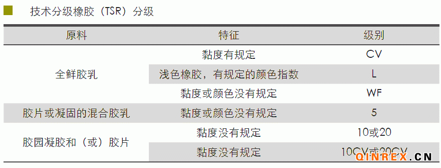 顆粒較(即標(biāo)準(zhǔn)膠SMR,也稱技術(shù)分級橡膠TSR)是按國際上統(tǒng)一的理化效 能、指標(biāo)來分級的,這些理化性能包括雜質(zhì)含量、塑性初值、塑性保持率、氮含 量、揮發(fā)分含量、灰分含量及色澤指數(shù)等,其中以雜質(zhì)含量為主導(dǎo)性指標(biāo)。根據(jù) 國標(biāo)GB/T8081-2008,技術(shù)分級橡膠(TSR)的分級應(yīng)根據(jù)TSR的性能和生產(chǎn)TSR 所用的原料而定(見下表)。
