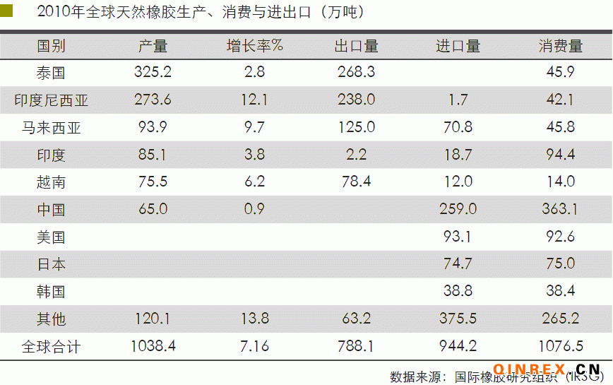 天然橡膠樹(shù)屬熱帶雨林喬木,種植地域基本分布于南北緯15度以內(nèi),主要集中在東南亞地區(qū),其種植面積約占世界天然橡膠種植面積的90%。主要生 產(chǎn)國(guó) 為泰國(guó)、印度尼西亞、馬來(lái)西亞、印度、越南、中國(guó)、緬甸、斯里蘭卡等,尤以 前三國(guó)為主,2010年前三國(guó)產(chǎn)量占世界總產(chǎn)量的66.7%,且其所產(chǎn)天然橡膠的絕 大部分用于出口。目前,泰國(guó)是全球天然橡膠產(chǎn)量和出口量最大的國(guó)家,2010 年出口量達(dá)268.3萬(wàn)噸,占產(chǎn)量的82.5%。然而2010年泰國(guó)產(chǎn)量增速放緩,僅為2.8%。第二、第三產(chǎn)膠國(guó)印度尼西亞和馬來(lái)西亞的產(chǎn)量增速較快, 這主要受2010 年天然橡膠價(jià)格連創(chuàng)新高,提振了膠農(nóng)割膠的積極性以及馬來(lái)西亞?wèn)|北部前幾年 擴(kuò)種、膠林產(chǎn)量增加的影響。