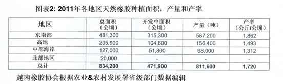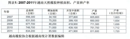 2011年,越南種植總面積達(dá)到834,200公頃,占全球橡膠種植總面積的7%左右。2011年越南天然橡膠產(chǎn)量為811,600噸,占全世界天膠產(chǎn)量的7.4%,天然橡膠生產(chǎn)力為1,720公斤/公頃,僅次于印度和泰國。越南2011年天然橡膠出口量為816,600噸,約占全球天膠出口量的9.7%,出口金額達(dá)到32.3億美元。