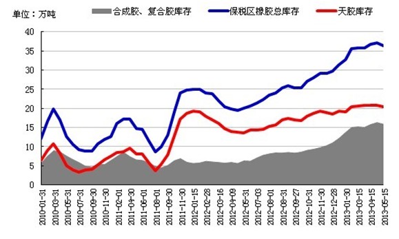 然而2012年以來,青島保稅區(qū)橡膠庫存幾乎全年維持20萬噸以上的高位,8月底更是創(chuàng)下了25萬噸的歷史新高,此后歷史記錄不斷被刷新。2013年2月底青島保稅區(qū)庫存上破35萬噸高位,3月上旬的倉庫失火事件曾一度引發(fā)規(guī)范倉庫管理傳聞,但后期僅僅針對重點倉庫進行了相應(yīng)檢查,未能阻止庫存攀升態(tài)勢,截止4月底,青島保稅區(qū)橡膠總庫存為37.11萬噸,其中天膠庫存為20.79萬噸。