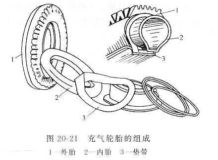這種輪胎(圖20-21)由內(nèi)胎2、外胎1和墊帶3組成。內(nèi)胎中充滿著壓縮空氣;外胎是用以保護(hù)內(nèi)胎使其不受外來(lái)?yè)p害的強(qiáng)度高而富有彈性的外殼;墊帶放在內(nèi)胎與輪輞之間,防止內(nèi)胎被輪輞及外胎的胎圈擦傷和磨損。