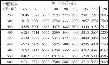 假設海南、云南年均投入成本均為425元/畝,產(chǎn)出分別為75公斤/畝和105公斤/畝,由此換算的海南天然橡膠種植成本為5667元/噸,云南天然橡膠種植成本為4048元/噸。我們將每畝天然橡膠的種植成本投入與相應單產(chǎn)所換算出的單位重量生產(chǎn)成本做成了矩陣表,如上。