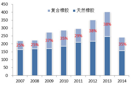 3. 近幾年天然橡膠、復(fù)合橡膠進(jìn)口情況(單位:萬(wàn)噸)
