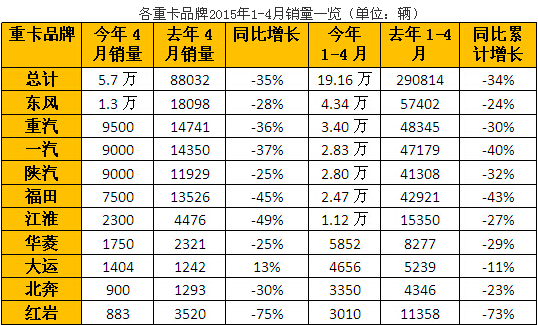累計(jì)來(lái)看,1-4月,國(guó)內(nèi)重卡 市場(chǎng)銷(xiāo)售19.16萬(wàn)輛,同比下降34%。其中,東風(fēng)繼續(xù)穩(wěn)居第一,累計(jì)銷(xiāo)售重卡4.34萬(wàn)輛,同比下降24%,比行業(yè)總體情況要好一些;第二名重汽累計(jì) 銷(xiāo)售重卡3.40萬(wàn)輛,同比下降30%;一汽銷(xiāo)車(chē)2.83萬(wàn)輛,同比下滑40%;陜汽和福田分別累計(jì)銷(xiāo)售2.80萬(wàn)輛和2.47萬(wàn)輛,同比下降32%和 43%。江淮重卡累計(jì)銷(xiāo)車(chē)1.12萬(wàn)輛,同比下降27%,降幅低于行業(yè)平均降幅;華菱、北奔和紅巖累計(jì)銷(xiāo)車(chē)5852輛、3350輛和3010輛,同比降幅 為29%、23%和73%。第八名大運(yùn)重卡累計(jì)銷(xiāo)售4656輛,同比下降11%,是前十名企業(yè)中下降幅度最小的。