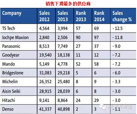 據(jù)了解,在這個百強榜中,輪胎企業(yè)的日子并不好過。在公布百強榜的同時,《汽車制造》公布了“銷售下滑最多的供應(yīng)商”排名,其中,輪胎三巨頭固特異、普利司通、米其林的名字赫然在列,分別減少7.2%、6%和3.3%。