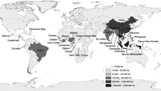 圖為全球天然橡膠種植分布