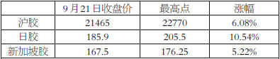 臺(tái)風(fēng)發(fā)生的這個(gè)時(shí)期,膠價(jià)發(fā)生了較大的上漲,其中滬膠最高上漲了6%以上;日膠漲幅超過10%;而新加坡橡膠漲幅超過5%。