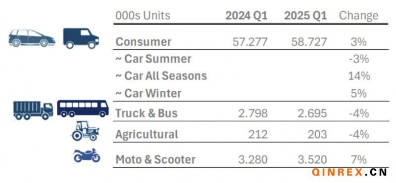 ETRMA秘書長表示,消費(fèi)輪胎領(lǐng)域,2024年下半年的復(fù)蘇(+8%)延續(xù)到了2025年第一季度。銷量接近疫情影響前的2019年第一季度水平。四季車胎細(xì)分市場的增長繼續(xù)推動該類別的增長。