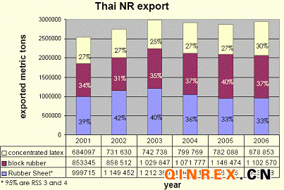 泰國橡膠出口的主要品種為標(biāo)準(zhǔn)膠、煙膠片和乳膠。2004年以前,煙膠片的出口量占一半左右,約占47% ,標(biāo)準(zhǔn)膠約占36%(其中煙片膠中的RSS3占81%和RSS4占16%),乳膠約占17%。2004年以后,標(biāo)準(zhǔn)膠的出口量超過了煙膠片,標(biāo)準(zhǔn)膠約占40%,煙膠片占30%,乳膠占20%。