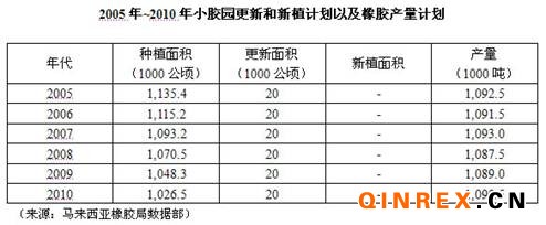 為了改變更新滯后的局面,馬來西亞小膠園發(fā)展局于1998年撥款1100萬馬元用于更新1200公頃膠園,750戶膠農(nóng)入選更新項目,每公頃可獲得4000-6000馬元的資助。馬來西亞現(xiàn)有166.3萬公頃的膠園,計劃每年更新4.17萬公頃, 到2010年將保持100萬~130萬公頃的植膠面積。