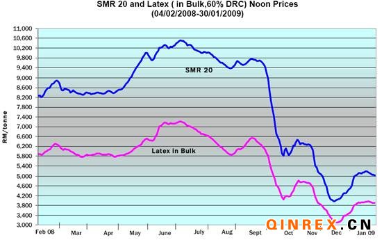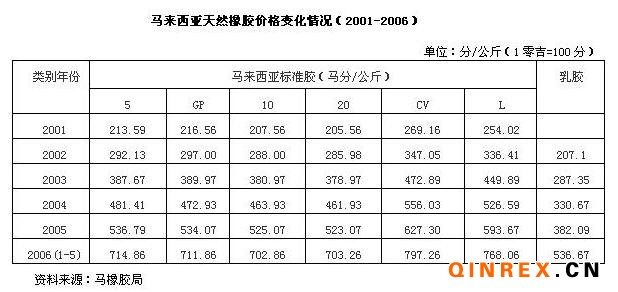 1995年至2001年,天然膠市場供大于求,價格持續(xù)下跌,2001年SMRCV、SMRL、 SMR5、SMR10、SMR20價格比1995年的分別下跌了43.5%、42.4%、45.9%、46%和46.3%。2002年起,橡膠價格開始反彈并直線上漲。2006年5月底上述五種天然膠價格分別上升為每公斤797.3分、768分、714.9分、702.9分和703.3分,比2001年價格增長了196%、202%、234%、239%和243%,天然橡膠價格達(dá)歷史最好水平。